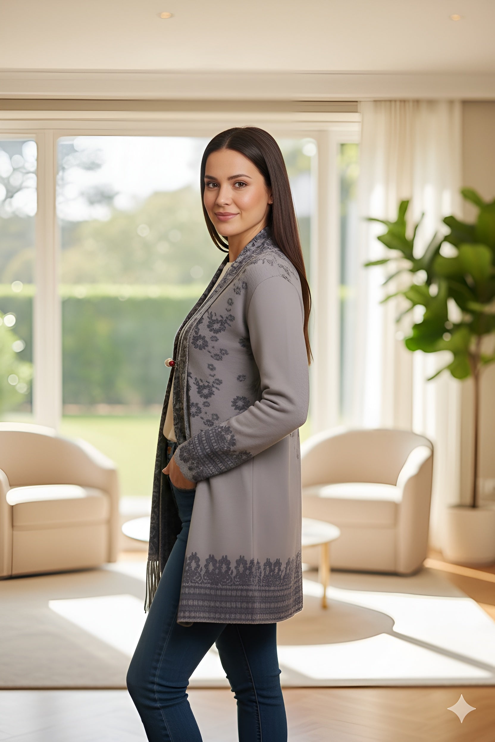 A beautifully patterned long knit cardigan (or shrug) that doubles as a statement accessory. It features a stunning grey jacquard pattern, a cozy fringe-detailed scarf collar, and a unique front closure. It offers perfect warmth and effortless style for indoors and outdoors.