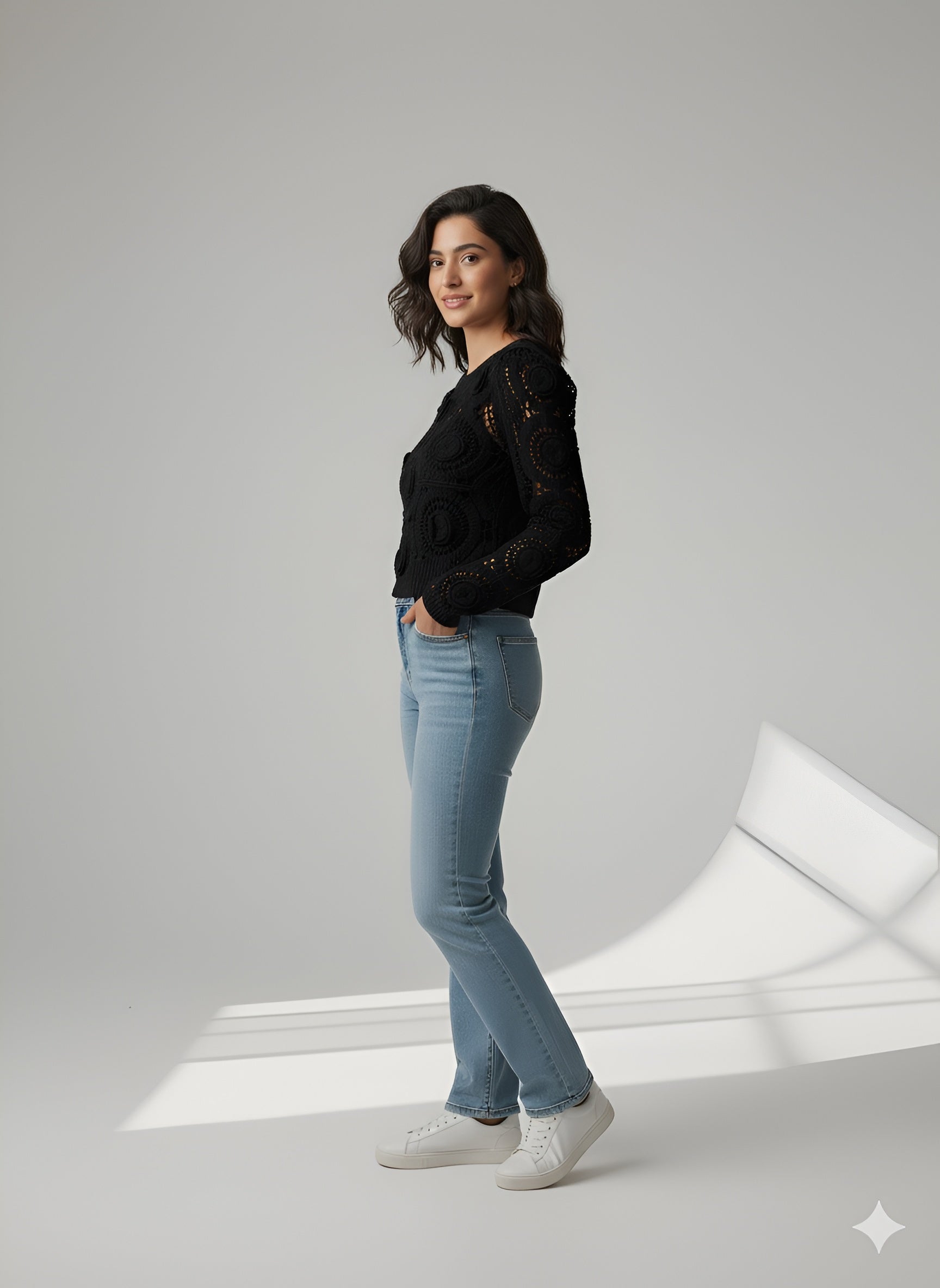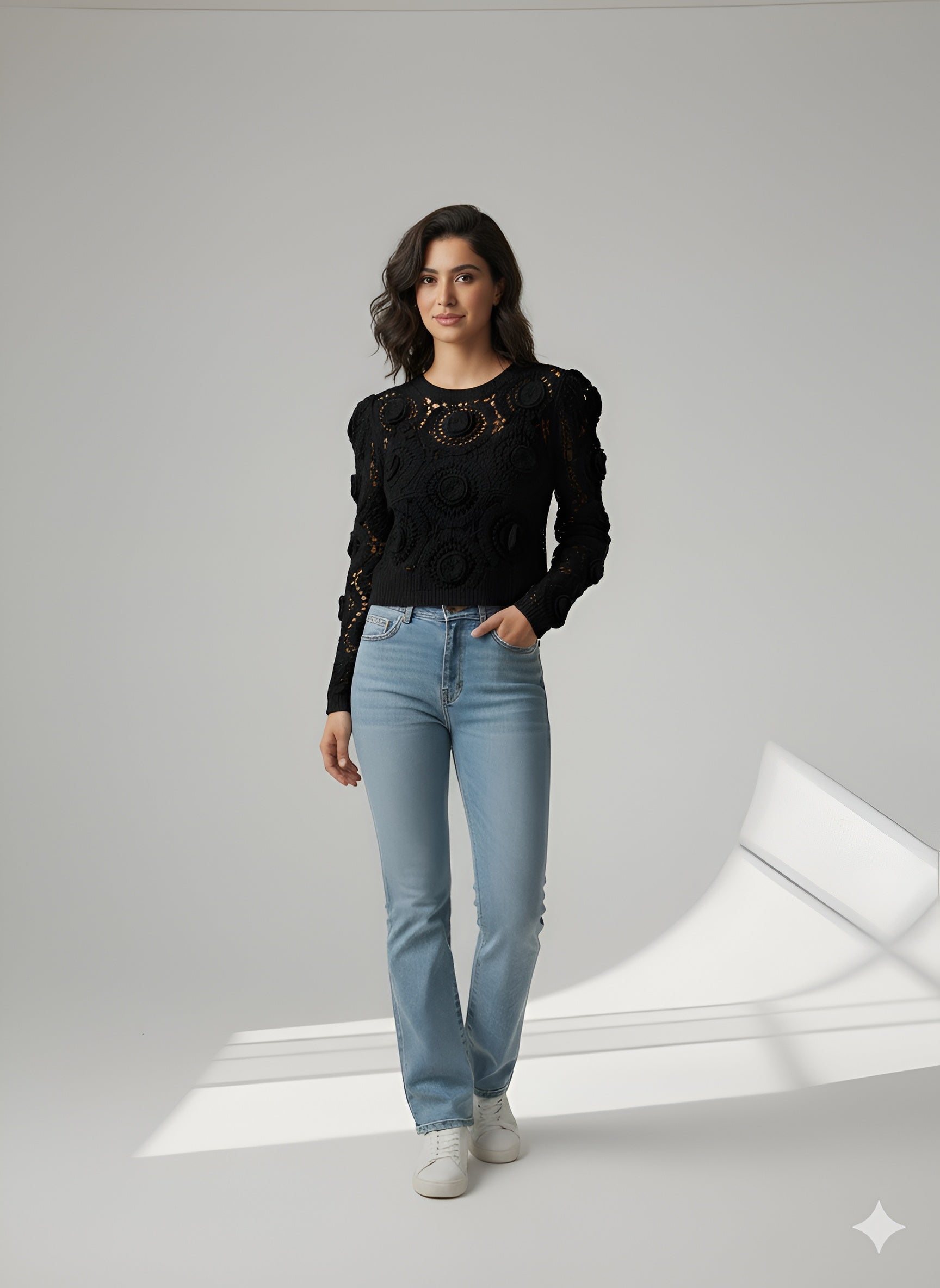 The ultimate sophisticated statement piece. This jet black top is knitted in an eye-catching crochet pattern and features highly fashionable puffed sleeves for dramatic effect. The cropped fit is designed to flatter any high-waist bottom. An instant upgrade to your night-out or elevated casual wardrobe.