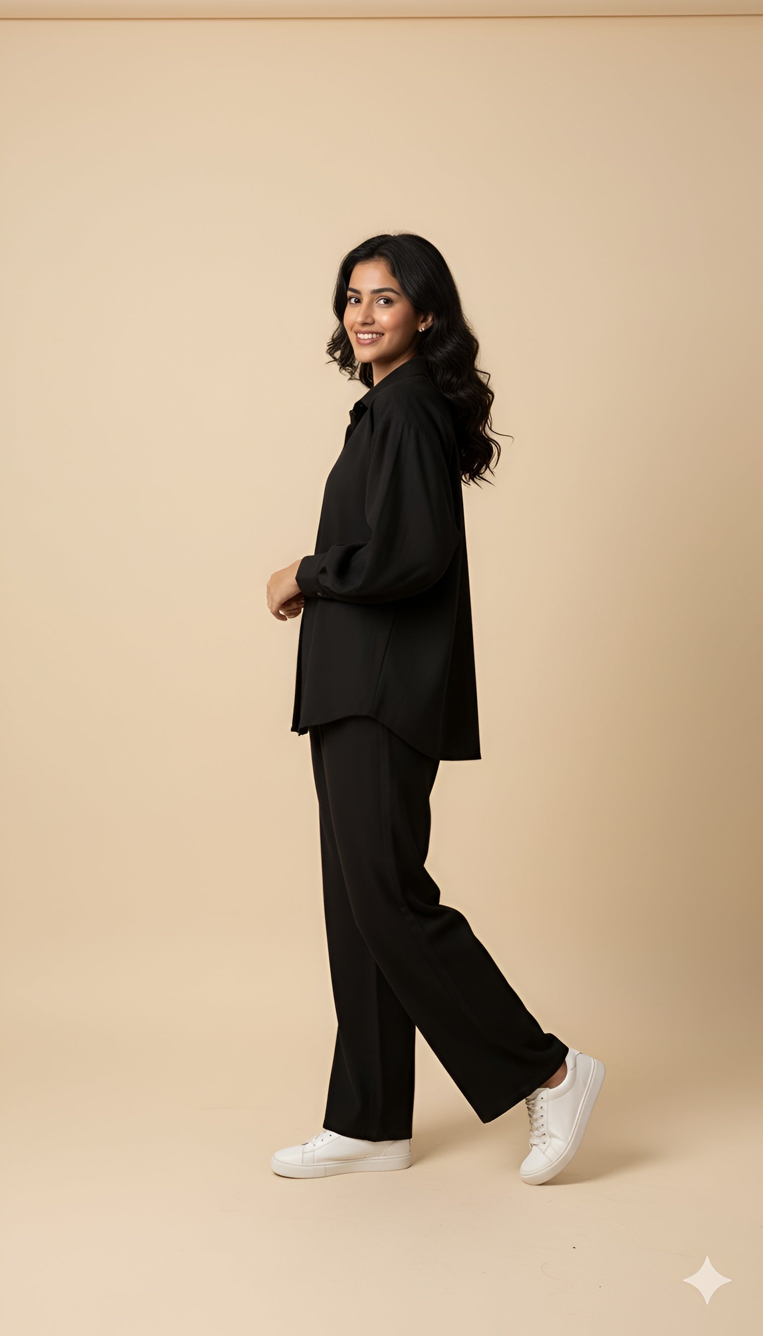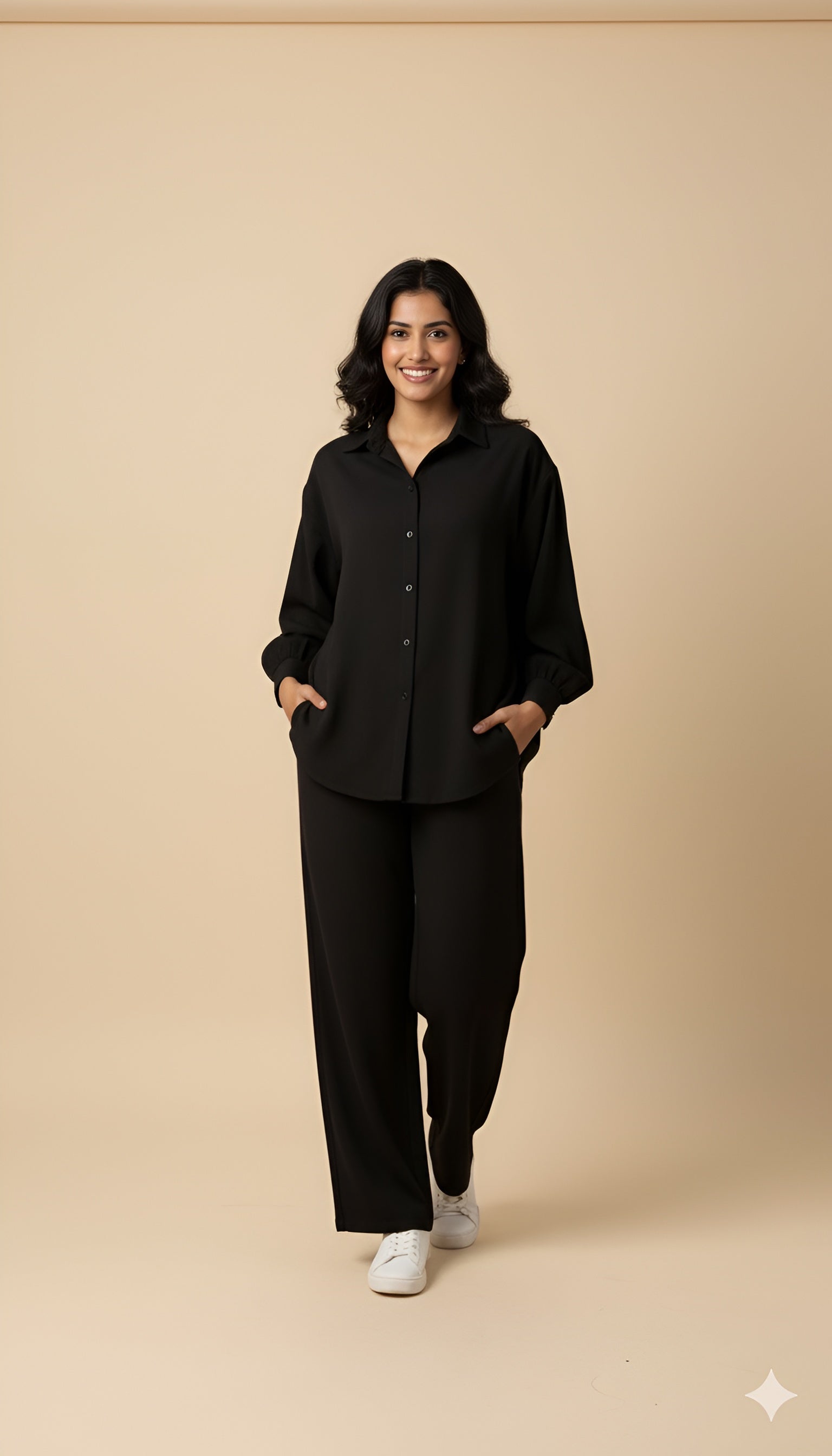 Your new go-to for effortless style. This black matching set includes a relaxed, textured button-up shirt and comfortable wide-leg pants. The soft material and clean, monochromatic design create a flattering, streamlined silhouette. Wear it as a complete outfit for instant polish, or style the pieces separately for endless versatility.