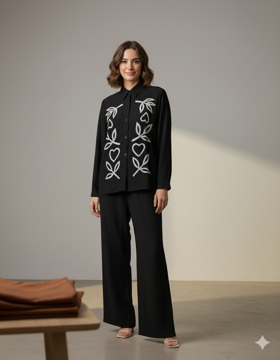 Step into a world of comfort without sacrificing style. This gorgeous all-in-one ensemble in a rich, warm brown, black, olive tone is your new wardrobe staple. The relaxed fit of the wide-leg trousers and the soft drape of the long-sleeve shirt provide all-day ease. What truly sets it apart is the unique, hand-drawn-style white embroidery that cascades down the front, transforming this loungewear-inspired silhouette into a piece of wearable art.